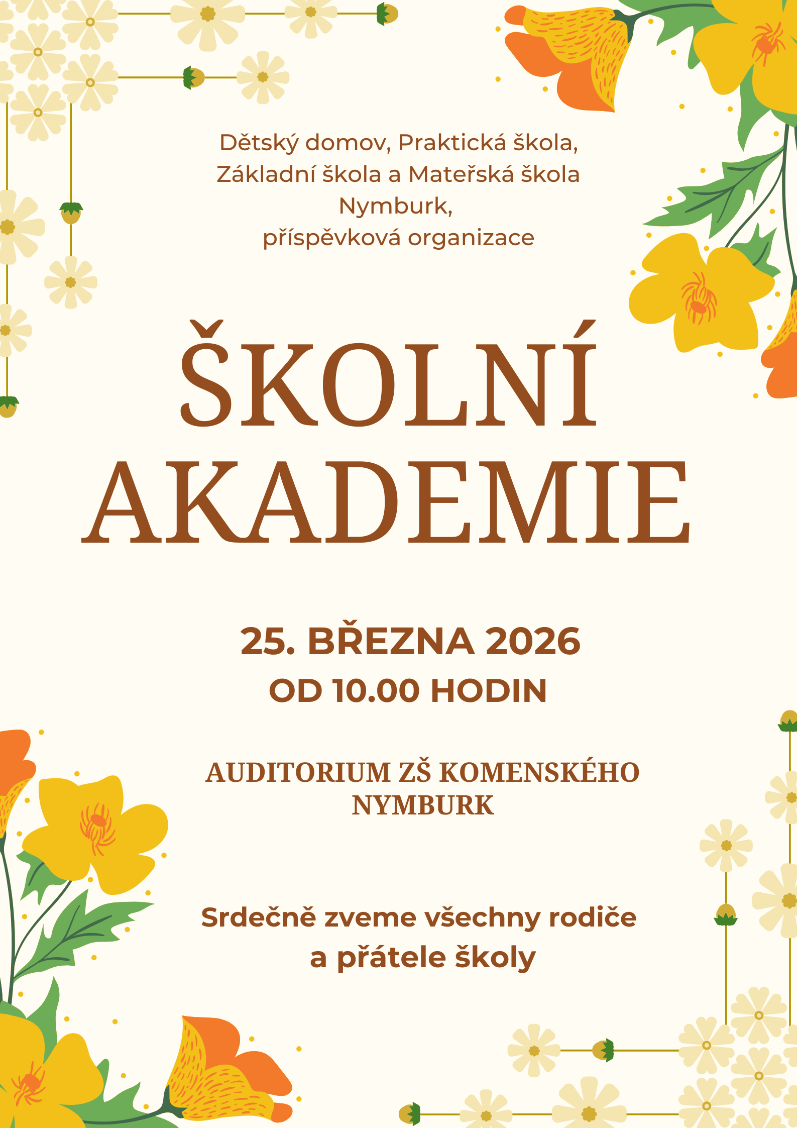 Školní akademie se koná 25. 3. 2026 od 10.00 v Auditoriu ZŠ Komenského Nymburk.