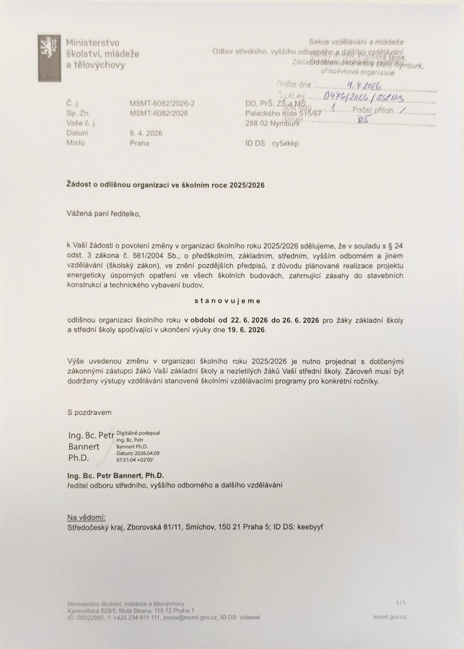 dovolte mi informovat Vás o změně organizace závěru školního roku 2025/2026.